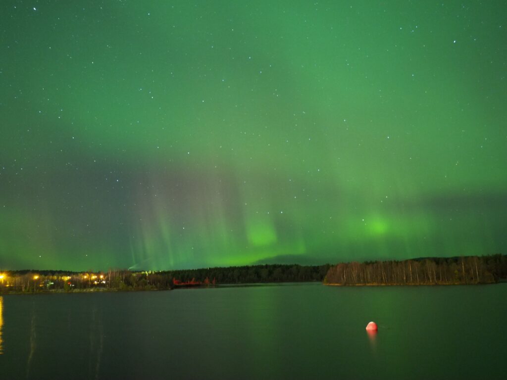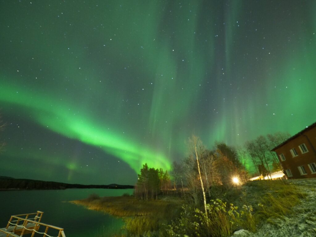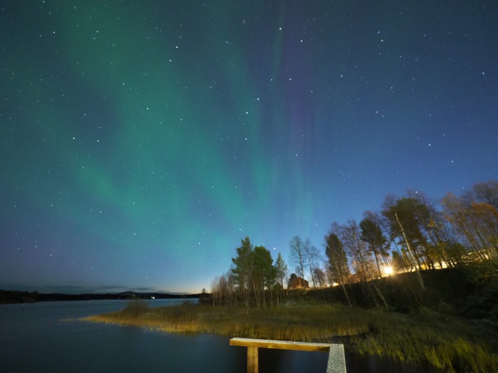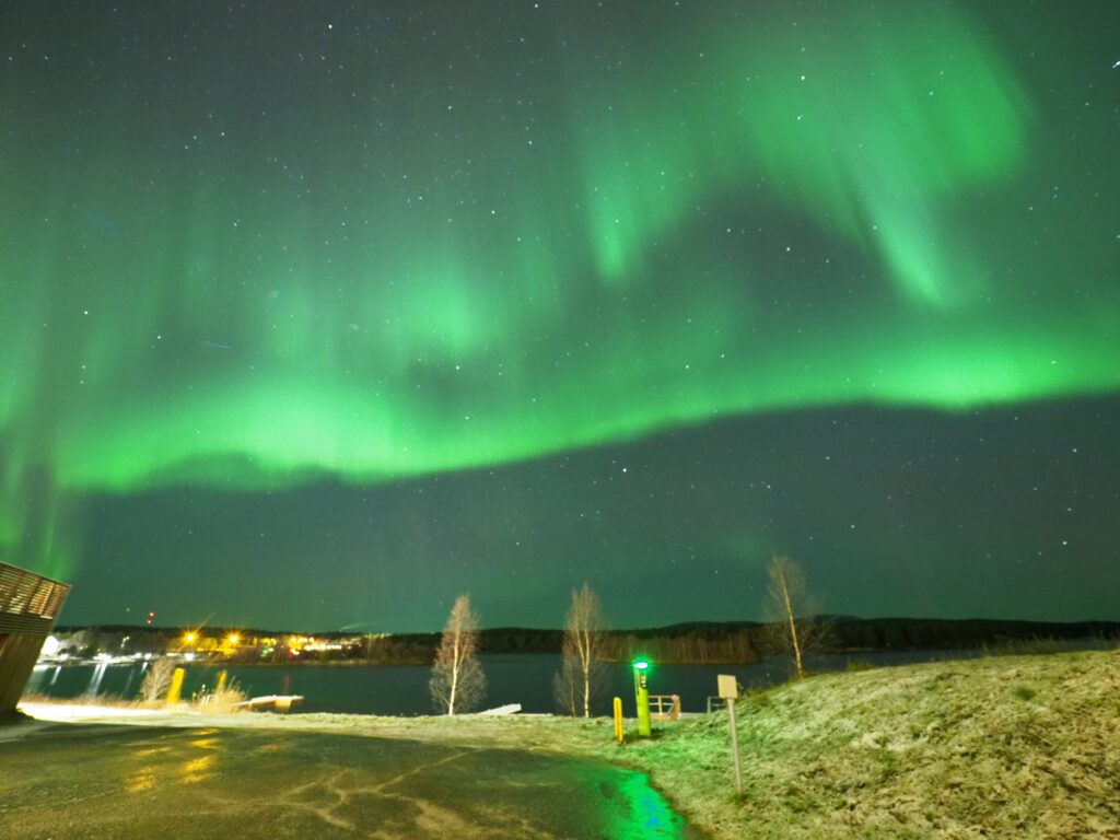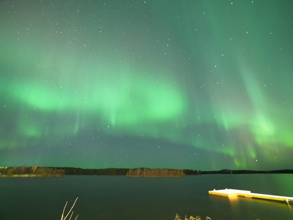 さっと湖畔から空に向けて写真を撮ると画角一面にオーロラが広がっていました。肉眼では北斗七星や星たちと雲のカーテンのようにしか見えませんが間違いなくオーロラでした。風もなく湖面に反射したオーロラがうっすら撮れています。