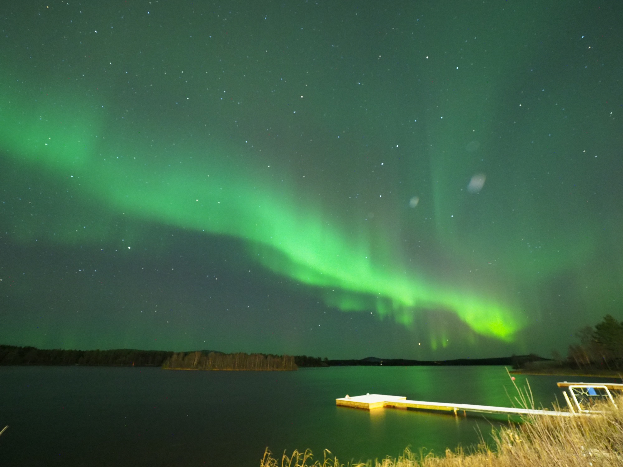 さっと湖畔から空に向けて写真を撮ると画角一面にオーロラが広がっていました。肉眼では北斗七星や星たちと雲のカーテンのようにしか見えませんが間違いなくオーロラでした。風もなく湖面に反射したオーロラがうっすら撮れています。