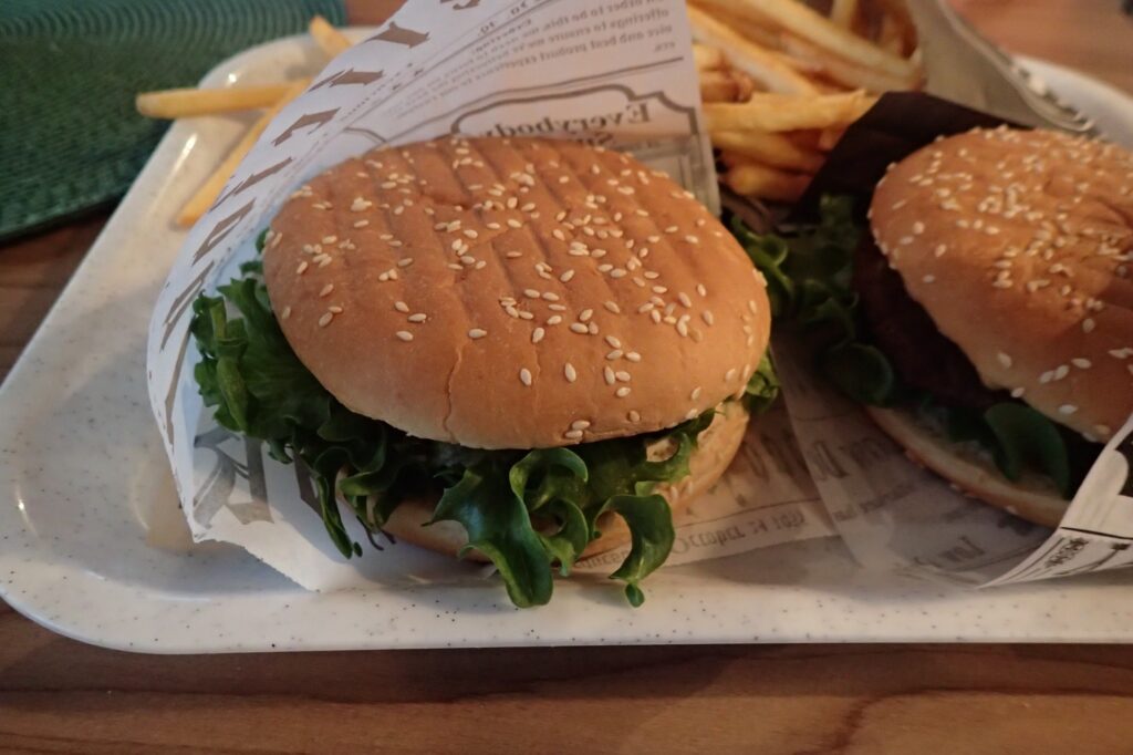 とても美味しいバーガーでした。ポテトがサクサクでとまらない。二人分で21.8ユーロ。