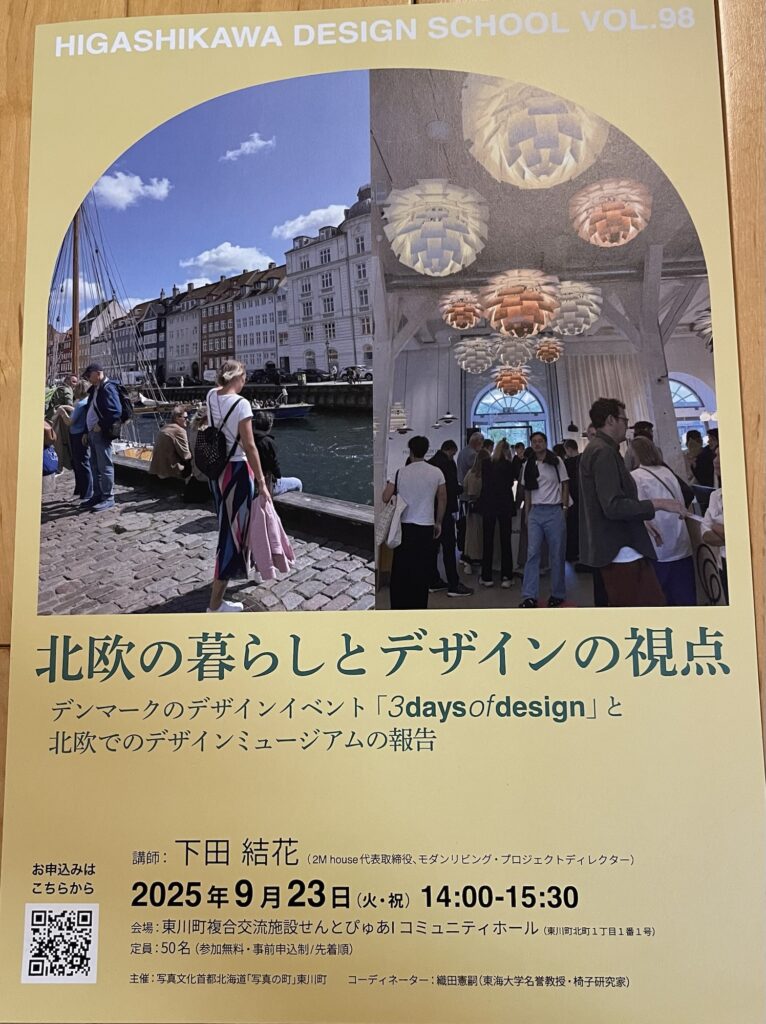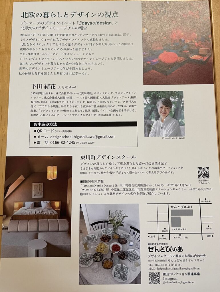 先日、東川町で開催された下田結花さんのデザインスクール「北欧の暮らしとデザインの視点」に参加してきました。テーマは、北欧デザインの美しさや暮らしの工夫を日常に取り入れる方法です。定員50名はほぼ埋まり、多くの方が北欧デザインへの関心を寄せていました。